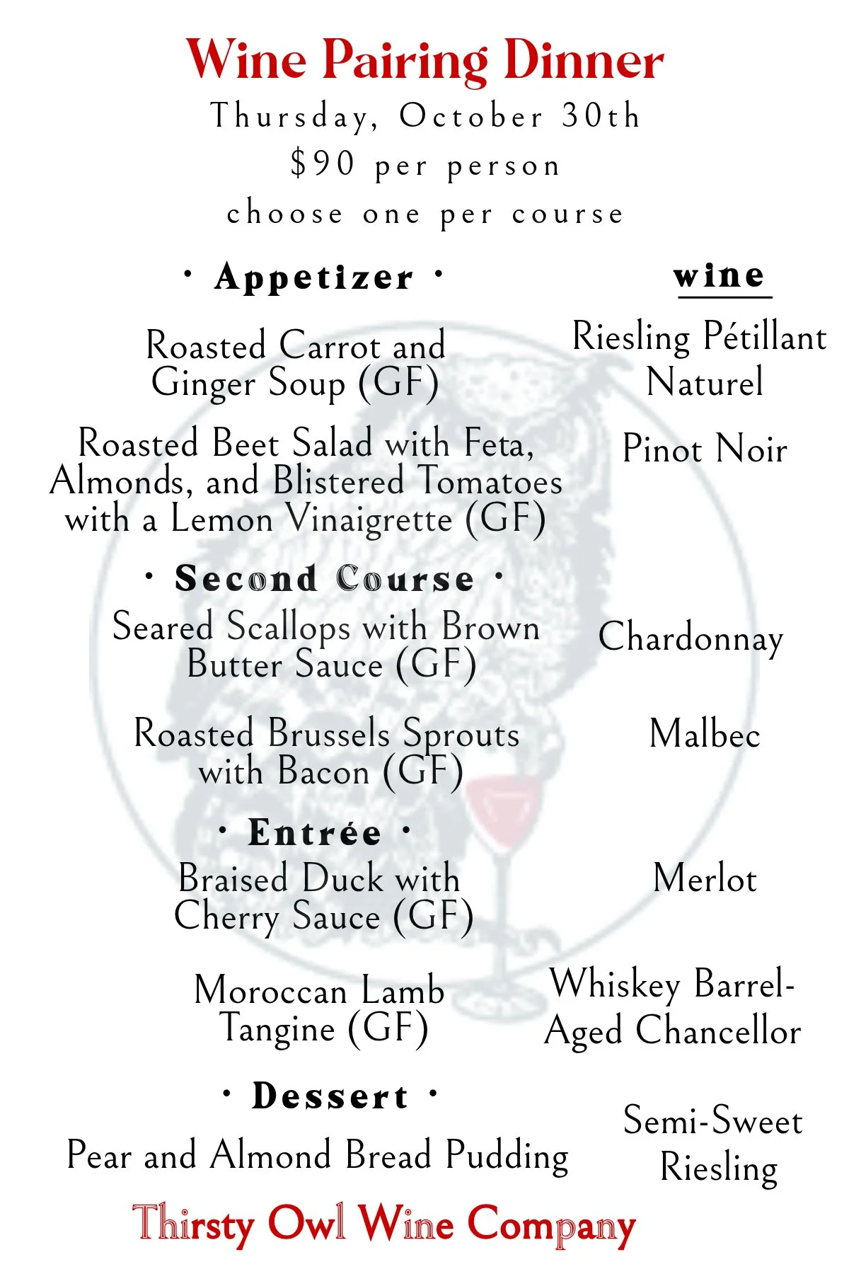 Four course meal paired with our own wines, open to the public! This month we’ll be featuring a Halloween costume contest, and gifting a free vintage bottle of wine to the winner!