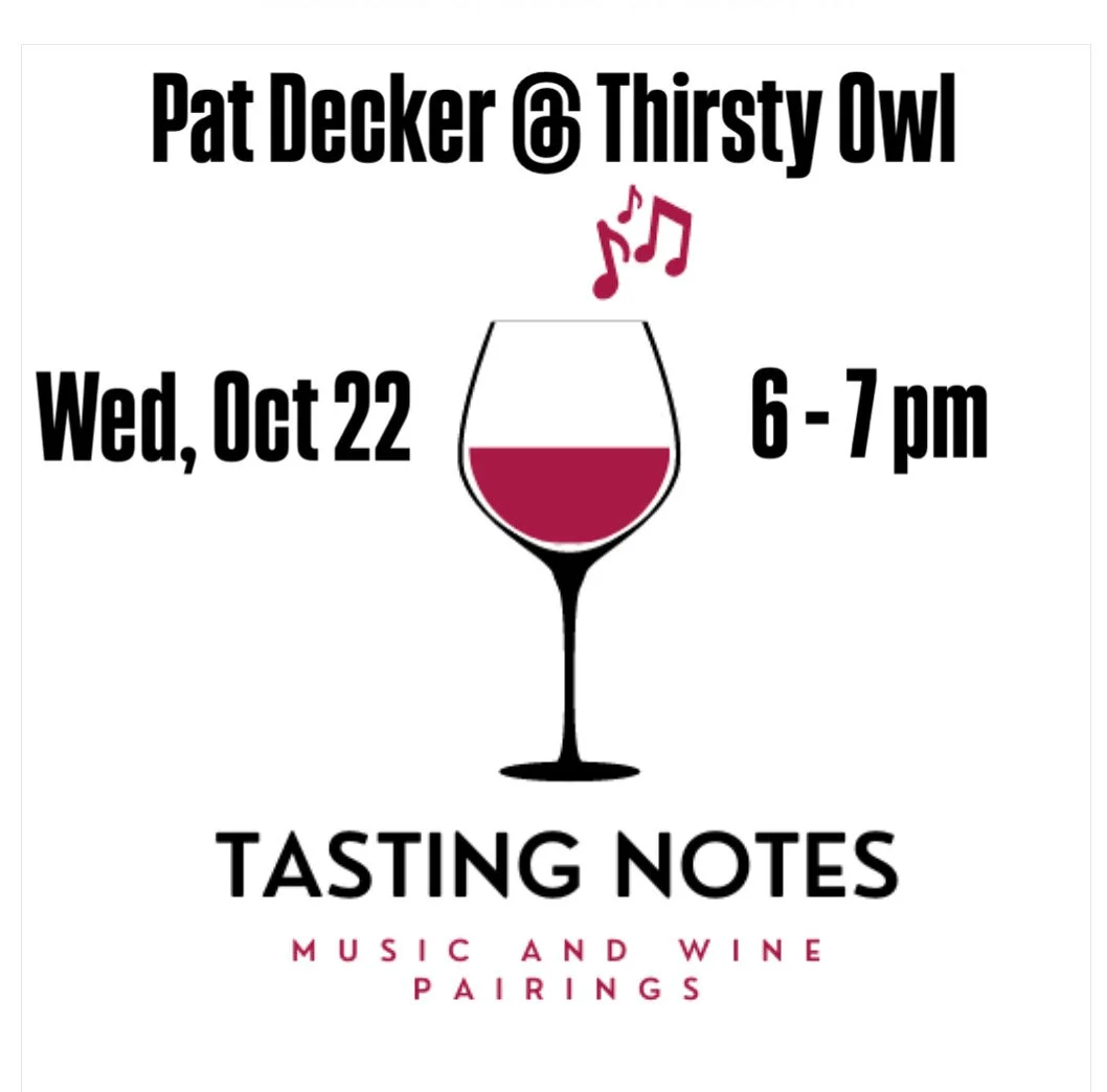 Acclaimed musician Pat Decker will perform live acoustic versions of five beloved songs, each thoughtfully paired with a signature Thirsty Owl wine. Before each song, we’ll share a bit of its story — the artist, the emotion, and why that melody inspired the wine in your glass.